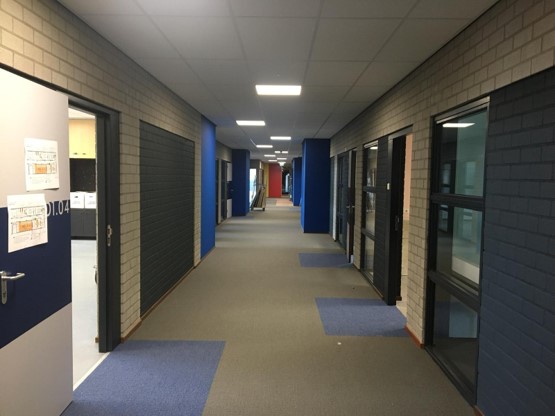 Na een intensieve voorbereiding en na een aanbesteding op basis van Best Value is aannemer Hunebouw met haar onderaannemers gestart met het up-to-date maken van de bestaande huisvesting. De eerste fase is in gebruik genomen. De gebruikers ervaren nu het gezonde binnenklimaat (klasse B) en de nieuwe kleurstelling. De komende winter wordt beoordeeld of de gasgestookte installatie afgekoppeld kan worden. Daarmee wordt het 30 jaar oude gebouw definitief gasloos. Om daartoe te komen is eerst de schil goed geïsoleerd en is er een all-electric VRF systeem (klimaatinstallatie) aangebracht. Bij vrijwel alle ontwerp- en materialisatiekeuzes is de doelstelling “circulair bouwen” meegenomen. Waar mogelijk is er gekozen voor het circulaire alternatief voor de reguliere materialen.