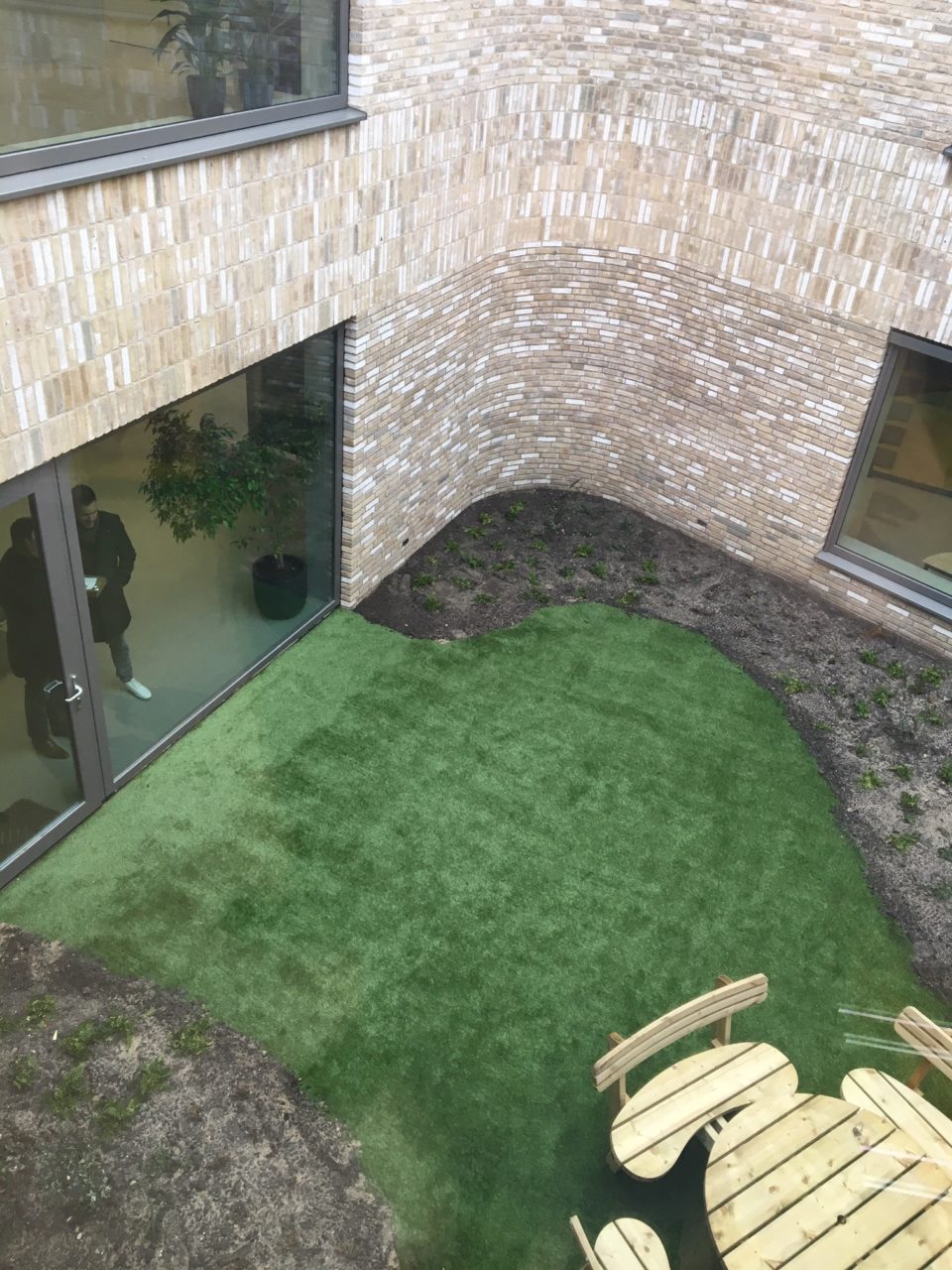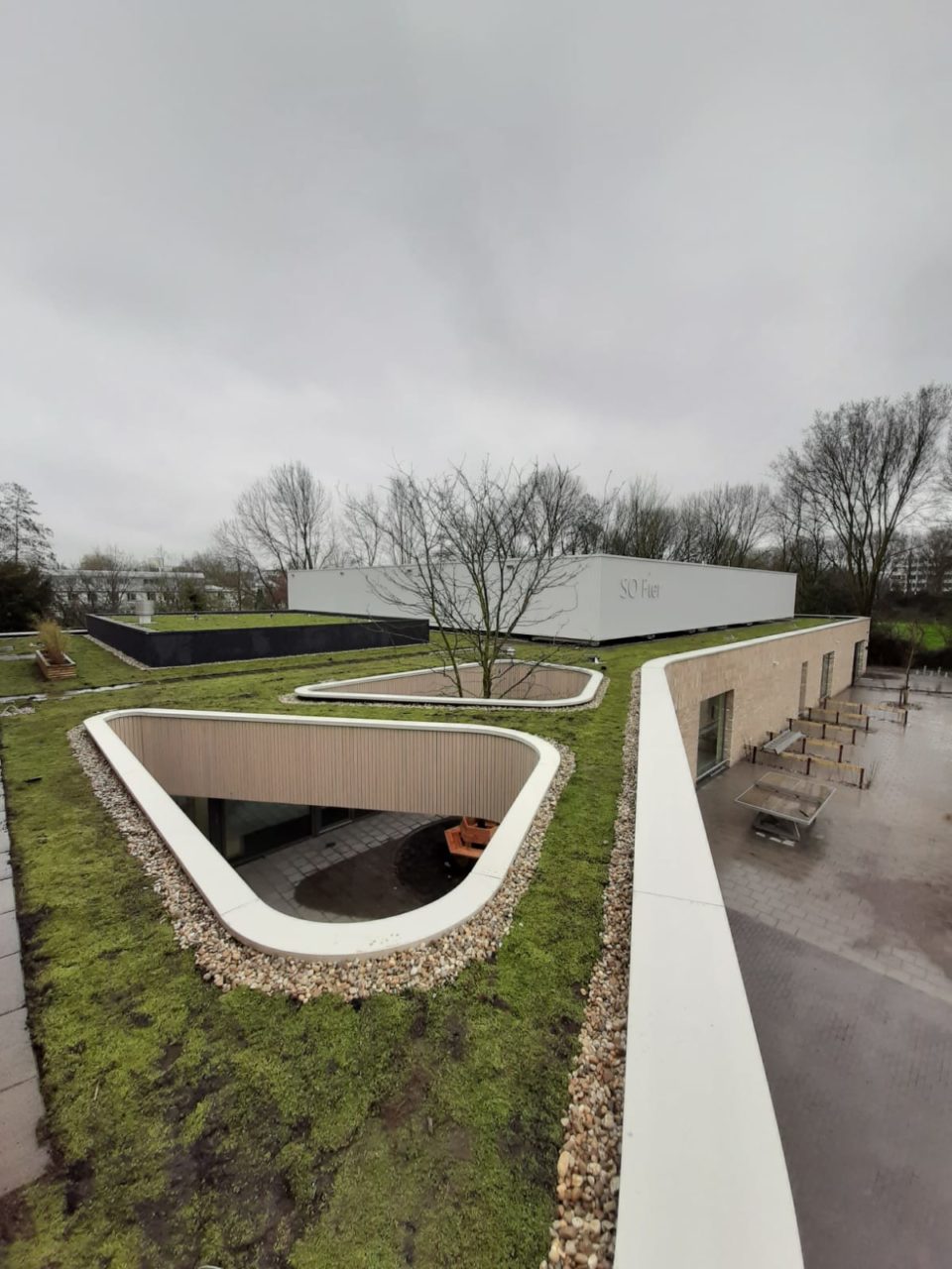 Een deel van het gebouw heeft een groen dak en door het entreegebied steekt een hoge boom die zorgt voor verbinding tussen gebouw en natuur.